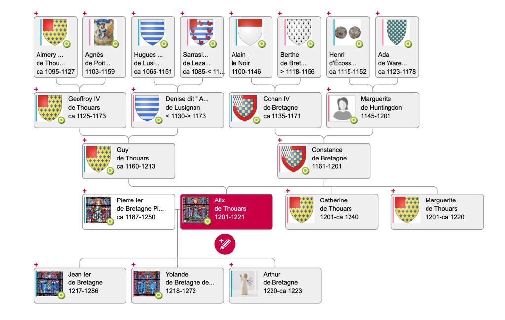 From her mother Constance de Bretagne (1151-1201), Alix de Thouars descends from, among many others, William the Conqueror (1027-1087) and his wife Mathilde de Flandres (ca 1031-1083), Henri Ier of England (ca 1068-1135), Malcolm III of Scotland (1031-1093) and his wife Saint Marguerite of Scotland (ca 1045-1093), Hugues Capet (ca 939-996) and his wife Adélaïde of Aquitaine (ca 950-? 1004), Anne de Kiev (ca 1024-ca 1075)…