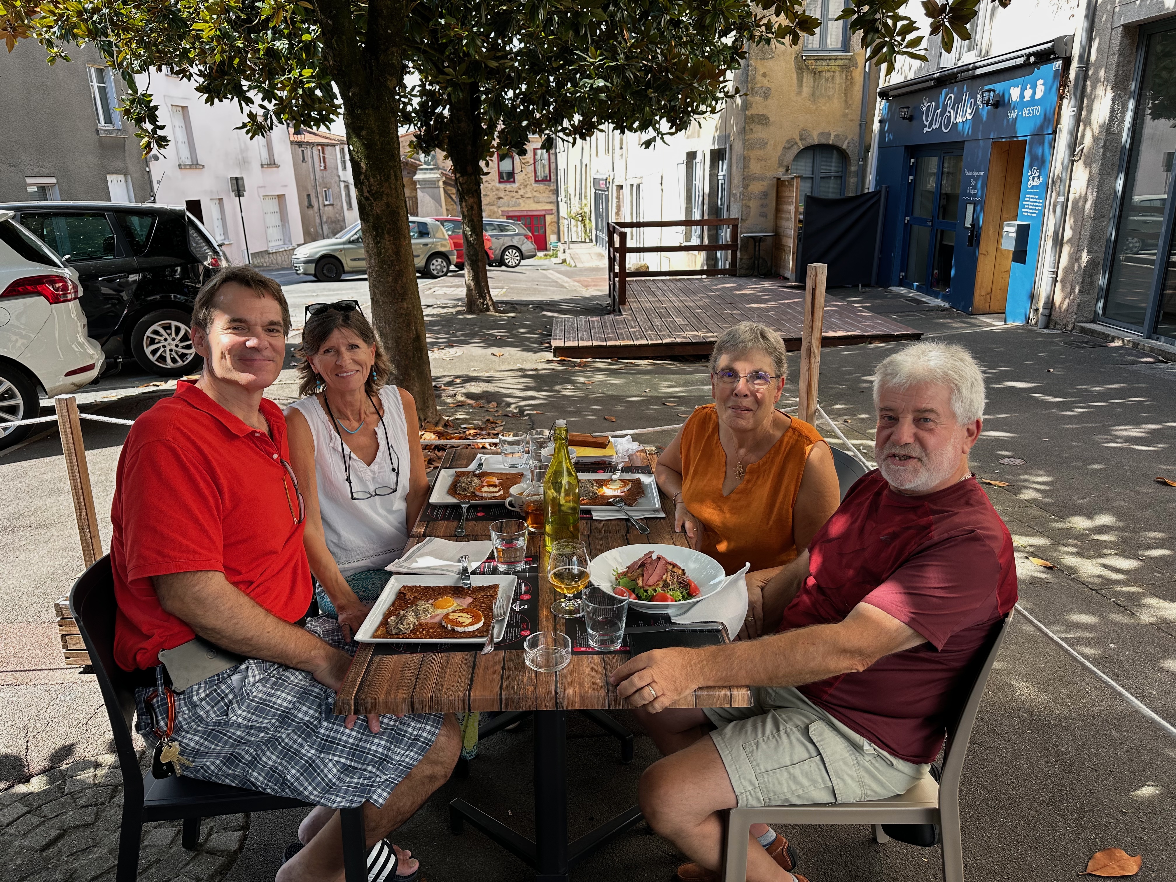 The four of us had such a wonderful day… We first had lunch in a restaurant (the galettes (buckwheat crêpes) and cider were absolutely a-ma-zing…), then visited the remains of the castle of Montaigu, and the Church of Saint-Jean-Baptiste which recently reopened after 5 years of renovation. It was a very hot day, so we finished the afternoon together having fruit juices on the terrasse of a little café by the church. When we said good bye at the end of the afternoon, it felt like we had known each other for a very long time!