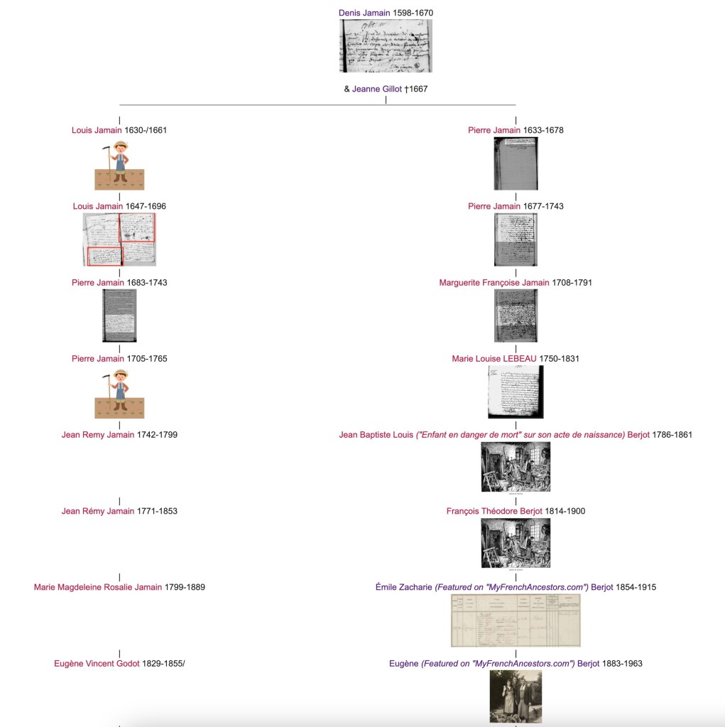 At the time Marie-Laure contacted me, she had built most of her family tree on paper, so I continued mine online on Geneanet to link each other. It turns out that we are 10th cousins of our grandparents Denis Jamain (1598-1670) and Jeanne Gillot (?-†1667)!