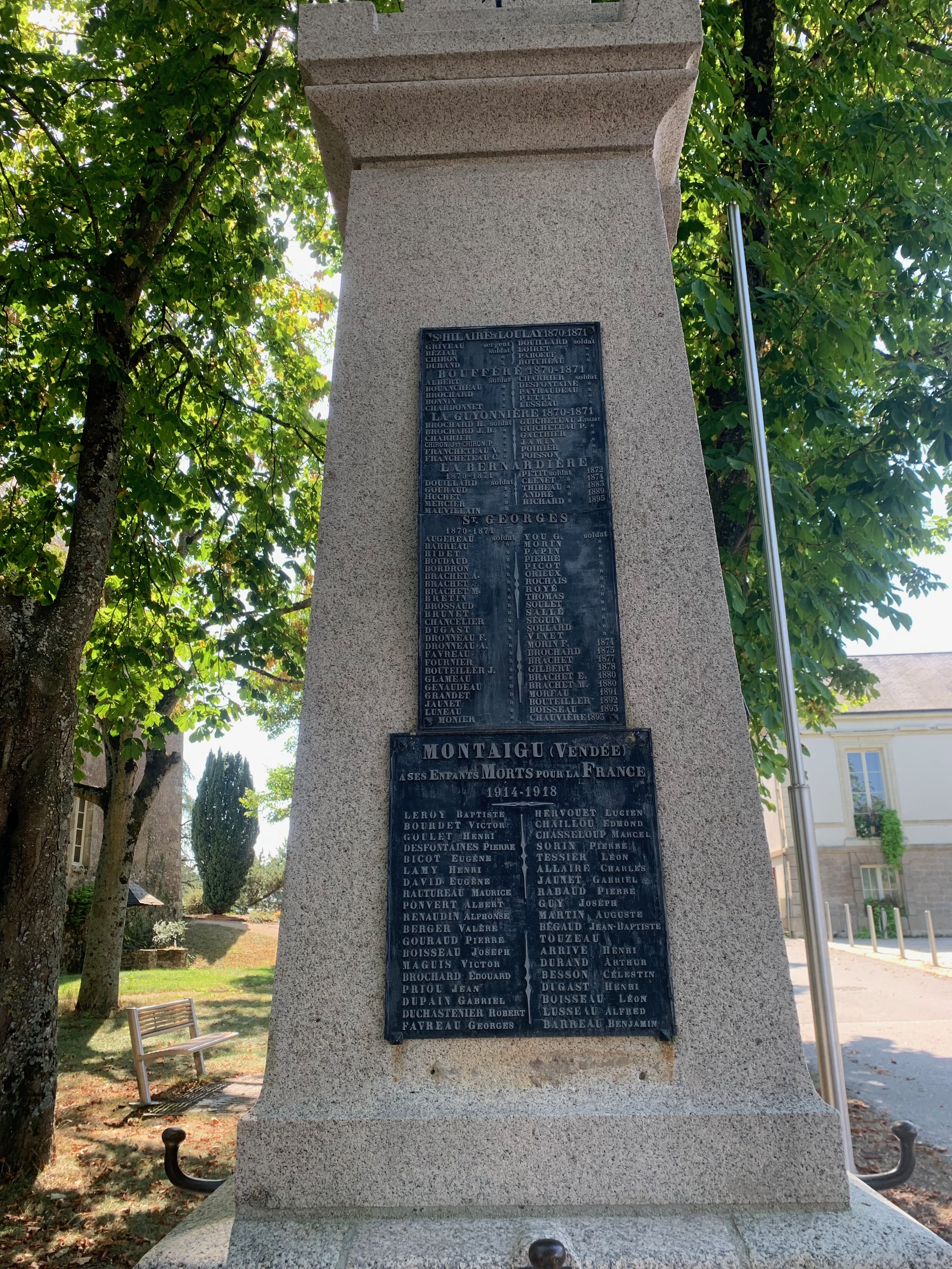 The memorial was inaugurated on September 11, 1898. It lists the names of individuals “Morts pour la France” (“died for France”) in Montaigu and other nearby villages during the Franco-Prussian War (1870-1871), WWI (1914-1918) and World War II (1939-1945).