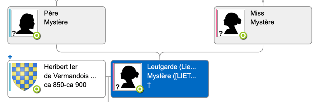 Miss Leutgarde Mystère is a perfect example of invisible women who left such an impact in History. She was the wife of Heribert Ier de Vermandois (ca 850-ca 900), great-great-grandson of Charlemagne and Hildegarde de Vintzgau. She is my ancestor (31 generations).