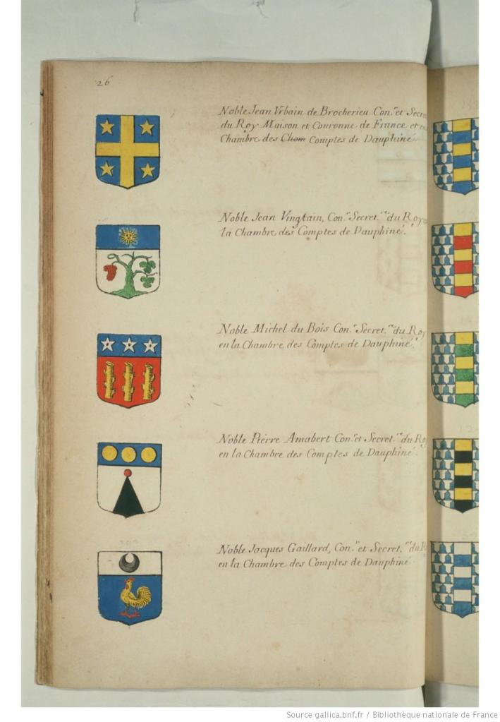 “Armorial Général de France” (sometimes called “Armorial d’Hozier”), by Louis-Pierre d’Hozier (1685-1767). The creation of these books was asked by King Louis XIV in 1696. There are 35 volumes listing the coat of arms of more than 120,000 people and families of the 25 old “provinces of France” at the end of the 17th century. This is what the Armorial d’Hozier looks like: