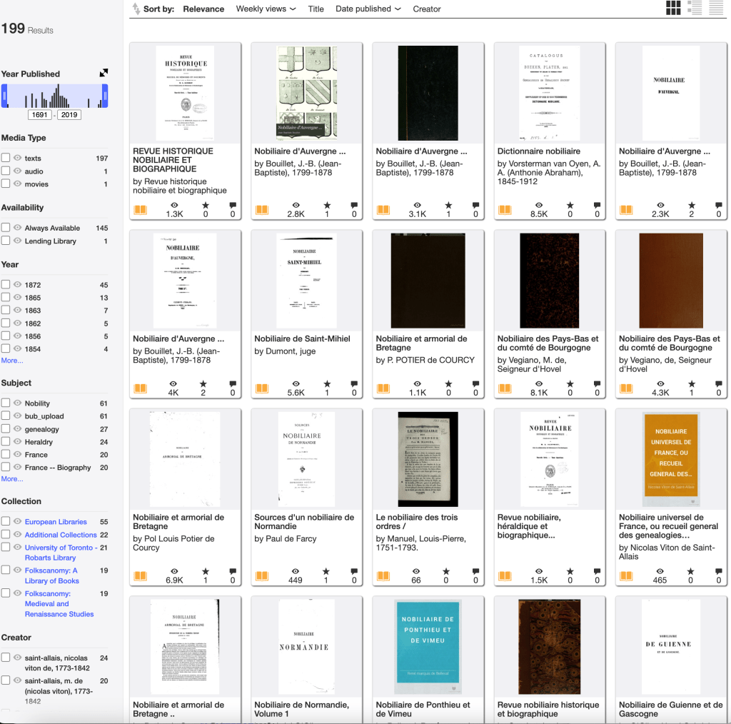 You will see for instance “Nobiliaire d’Auvergne“, Nobiliaire Universel de France“, “Nobiliaire de Bretagne“, etc. A lot of them have multiple volumes.