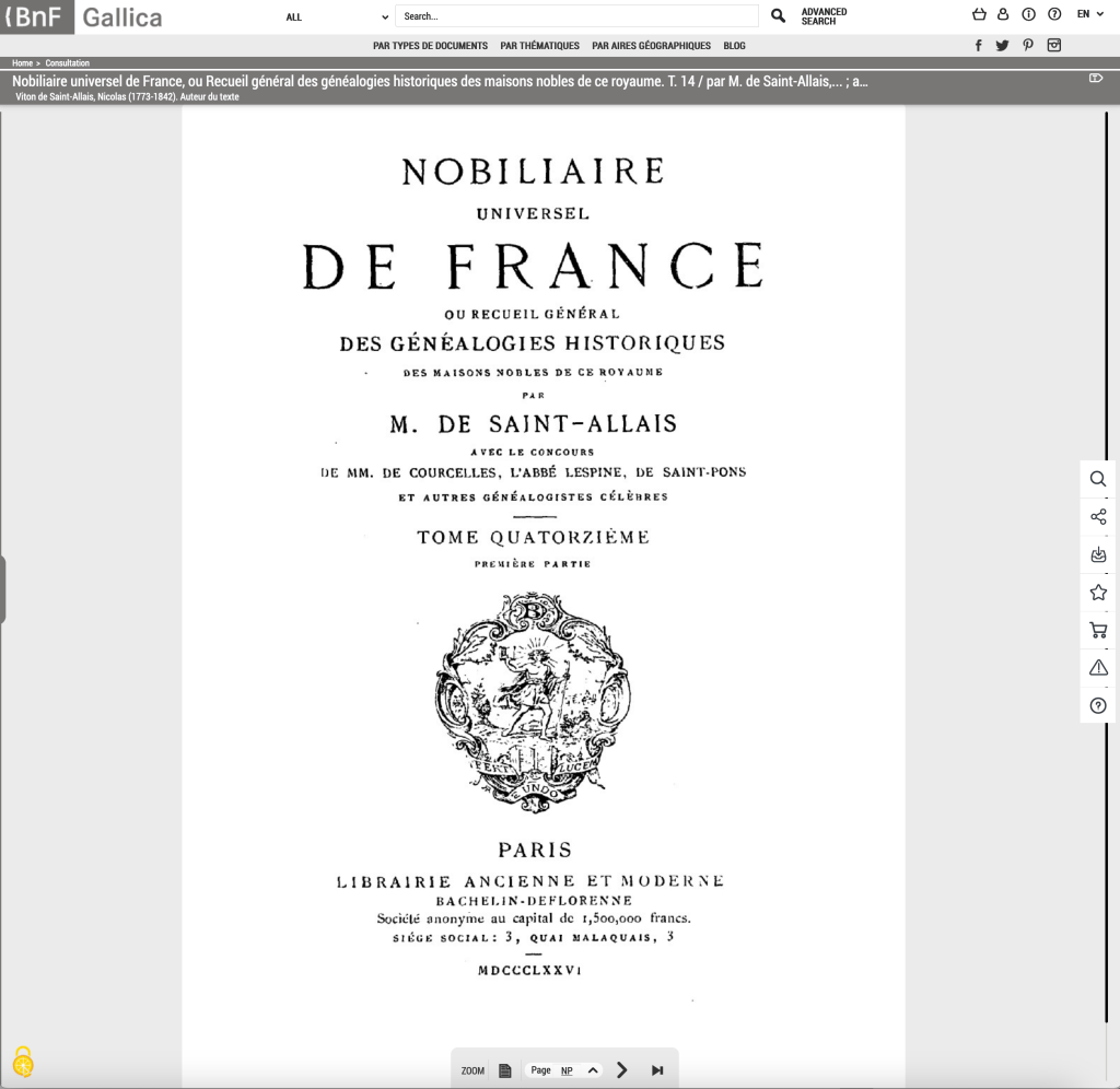 Nobiliaire: “which belongs to nobility”. These are books speaking of noble families and their genealogies. There are many, many books under the search word “Nobiliaire“: by region, by county, also some countries, and usually many different “Volumes” (or “Tomes“) under one title. “Nobiliaire d’Auvergne“, “Nobiliaire des Pays-Bas et du comté de Bourgogne“, “Nobiliaire Universel de France ou recueil général des généalogies historiques” (by Nicolas Viton de Saint-Allais) to name just a few. For instance, below is “Tome Quatorzième” (volume #14):
